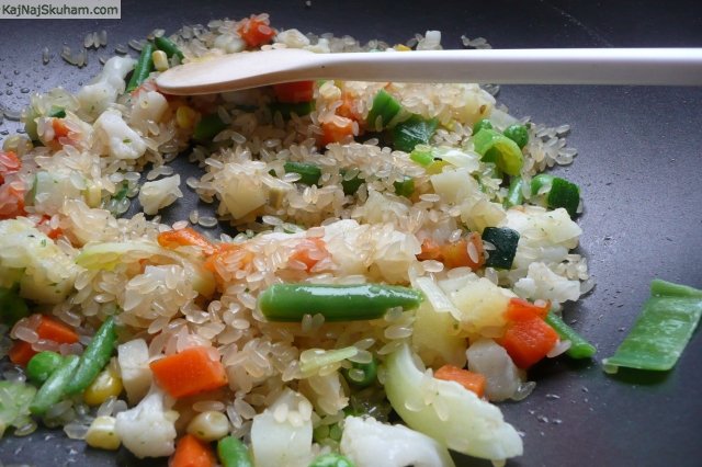 Na olju prepražimo zelenjavo, dodamo riž in ga pražimo da postekleni. Nato postopoma zalivamo z jušno osnovo ali s polovico jušne kocke in vodo. Vmes popopramo. Malo pred koncem kuhanja dodamo še paradižnikovo mezgo.