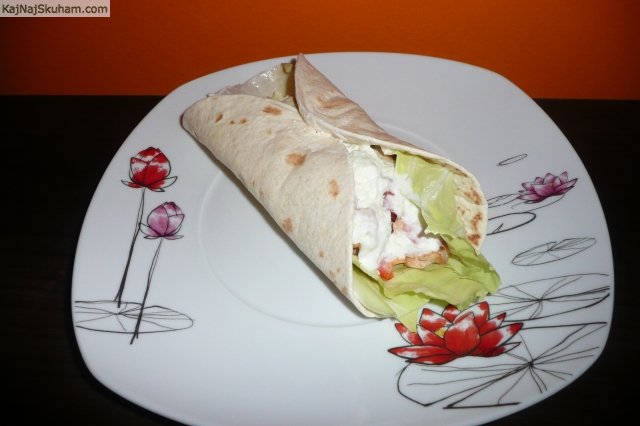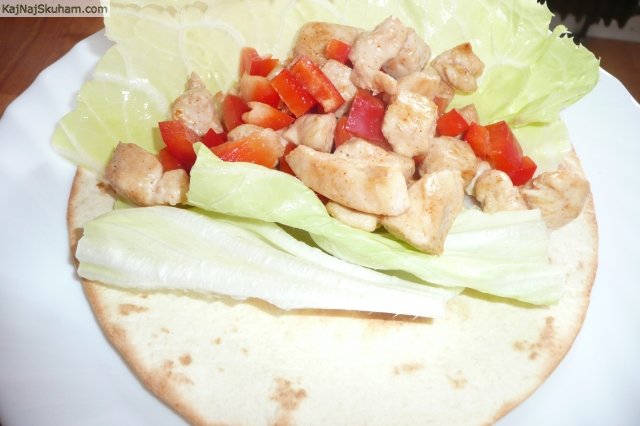 Piščanca narežemo na kocke in začinimo z mešanico začimb za perutnino. Papriko operemo, očistimo in narežemo na kocke. Piščanca na hitro popečemo olivnem olju in damo k nasekljani papriki. Tortilje pogrejemo po navodilih na embalaži. Na vsako tortiljo damo list oprane zelene solate, nadevamo s pečenim piščancem in papriko ter prelijemo z omako tzatziki.