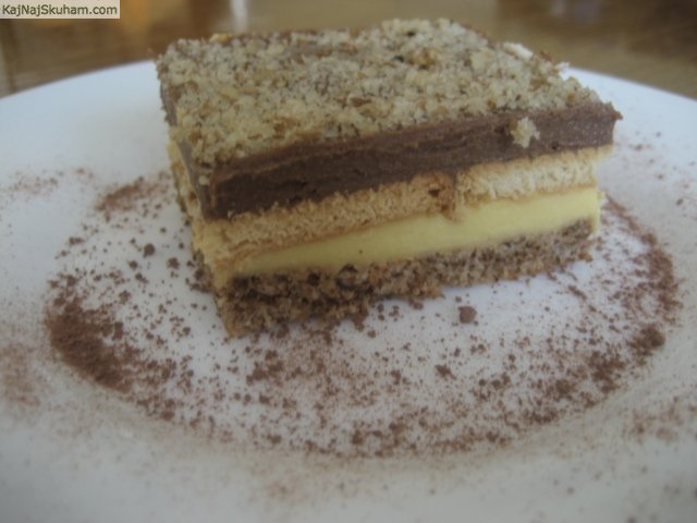 K ohlajeni kremi dodaš 1 margarino (25 dkg) in 1 vanilin sladkor. Na biskvit namaži pol rumene kreme, nanj položi albert kekse, ki si jih namočila v mleku, v drugo polovico kreme dodaš 10 dkg čokolade v prahu in zmešaš ter namažeš po keksih. Po vrhu potresi mlete orehe.