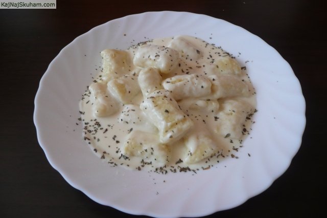 Njoke na hitro popečemo na olju. Zalijemo jih s smetano za kuhanje in potresemo z naribanim sirom. Dobro premešamo in pregrejemo omako.