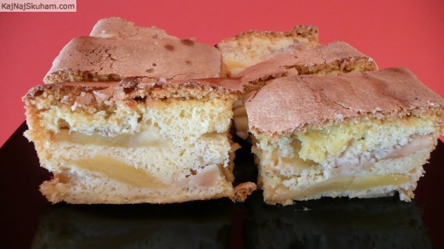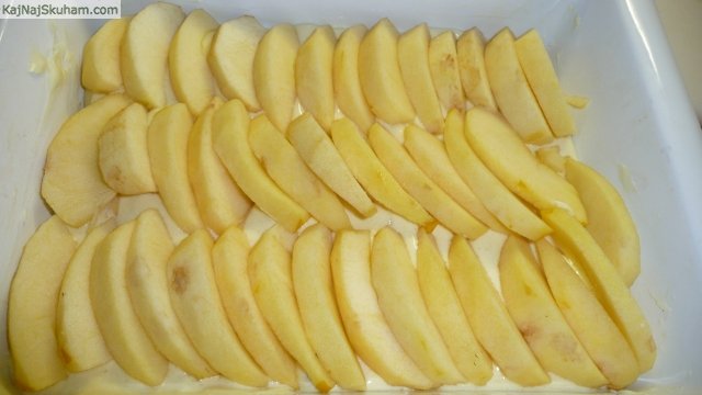 Jabolka olupimo, jim odstranimo pečke in narežemo na rezine. Jajci penasto stepemo s sladkorjem, nato primešamo moko presejano s pecilnim praškom. V pomaščen pekač izmenično nalagamo plast testa in plast jabolk, ki jih potresemo s cimetom. Na vrhu mora biti plast testa. Pečemo pri 180 stopinjah približno 30 minut.