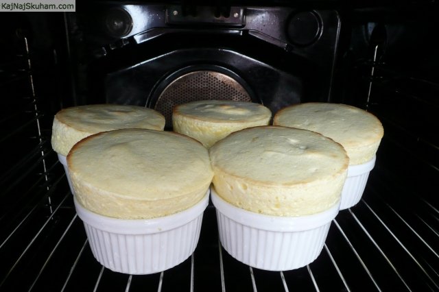 Z žlico zajamemo beljakov sneg in ga nalahno primešamo jajčni kremi, nato pa dodamo še preostalega in na hitro premešamo s krožnimi gibi. Maso naložimo v modelčke, na vrhu poravnamo z žlico in damo v predhodno ogreto pečico pri 180 stopinjah. Pečemo od 15-18 minut.
