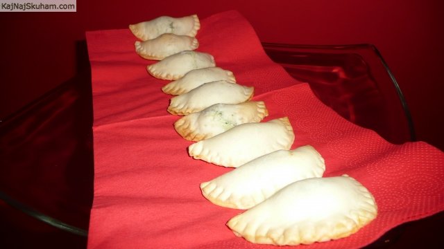 Vzhajano testo razvaljamo po površini in iz njega izrežemo kroge premera 12 cm. Vsak krog pokapljamo z oljem, na sredino damo žlico nadeva, in šunko, robove pa premažemo z razžvrkljanim jajcem. Testo prepognemo čez polovico in robove dobro zatisnemo. Žepke polagamo na pekač obložen s peki papirjem in pečemo v predhodno ogreti pečici pri 180 stopinjah približno 20 minut.