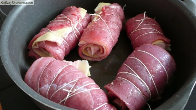 Zrezke pokrijemo s folijo in jih potolčemo. Na vsakega položimo rezini sira in šunko, potresemo s parmezanom in tesno zvijemo v rolado. Nato jih povežemo z vrvico in popečemo na vročem olju. Popečene rolade zalijemo z mlekom, tako da so prekrite in na majhnem ognju kuhamo toliko časa, da mleko izpari. Med kuhanjem meso večkrat obrnemo. Pečene roladice vzamemo iz kozice, vanjo zlijemo smetano in pokuhamo.