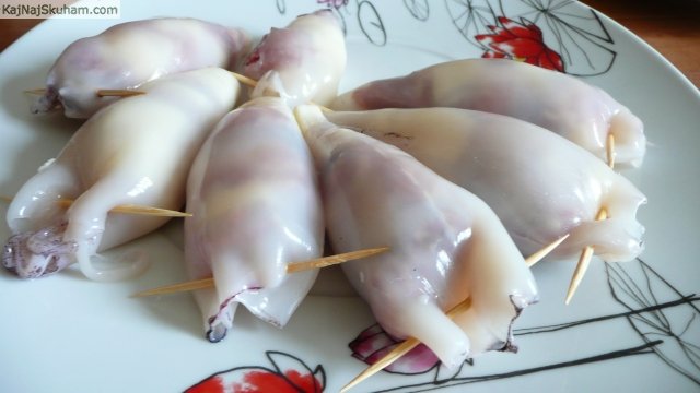 Očiščene lignje operemo. Na kocke sesekljamo mocarelo, prav tako slanino in skupaj z lovkami napolnimo lignje. Na koncih jih spnemo z zobotrebcem, da med peko ne uhaja nadev. Pečemo jih približno 6 minut na vsaki strani na zelo vročem olju. Pečenim lignjem odstranimo zobotrebce in postrežemo.