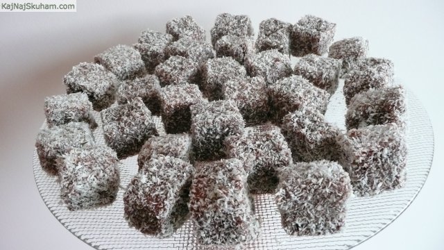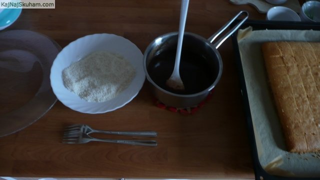 Vsako kocko pomočimo v preliv in nato povaljamo v kokosovi moki.