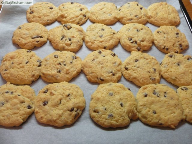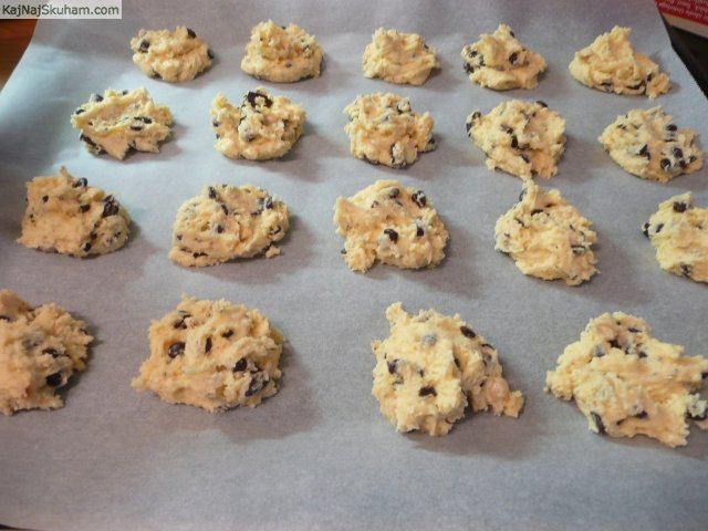 Z žlico zajemamo testo in kupčke polagamo na pekač obložen s peki papirjem. Pečemo pri 190 stopinjah od 9 do 12 minut. Pečene pustimo na pekaču še 2 minuti, nato pa jih preložimo na rešetko da se ohladijo.